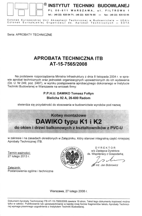 Posiadamy APROBATE TECHNICZNĄ ITB AT-15-7565/2008